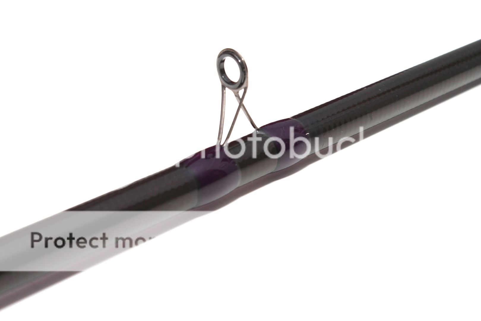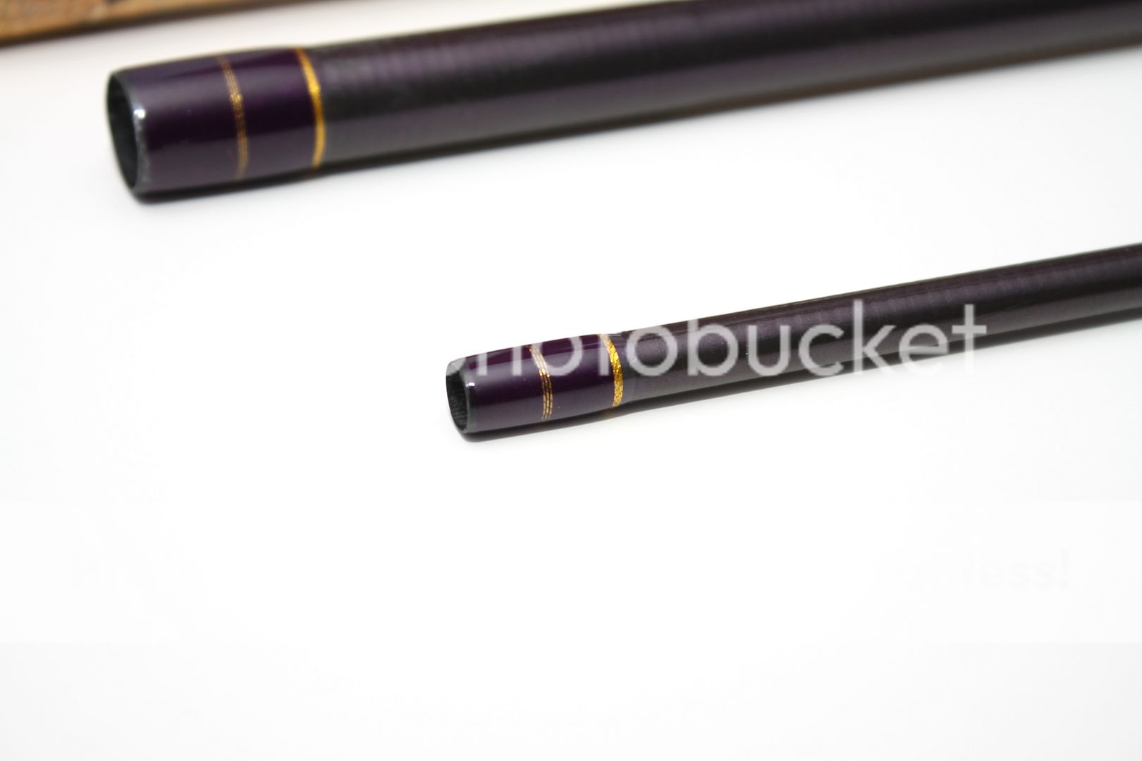 Pierścienie mocujące udało się zachować te oryginalne. zamontowane zostały nowe przelotki - omotki zamiast czarnych , wykonałem z nici w kolorze purpury , korespondujące z lekko purpurowym odcieniem blanku. By trochę wędkę ożywić i dodać jakiś elegancki akcencik - omotki wykańczające elemnty oraz rękojeść dostały małe wstawki z nici w kolorze zlotym.
