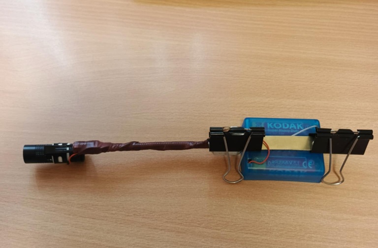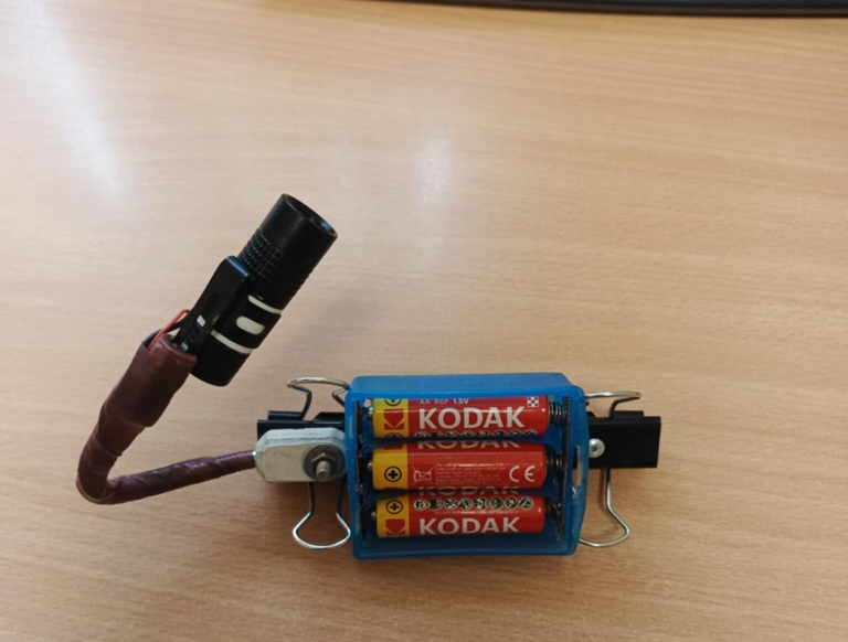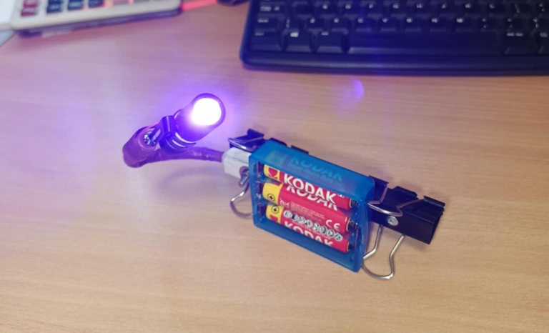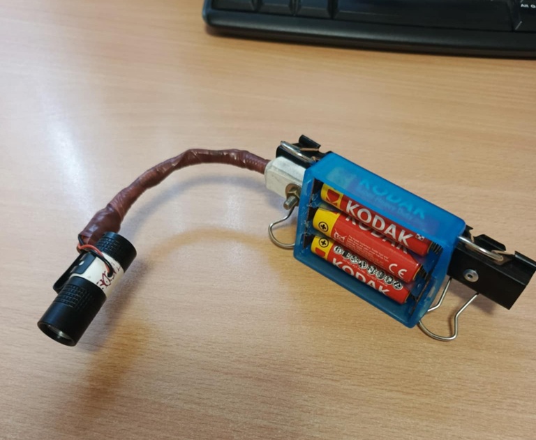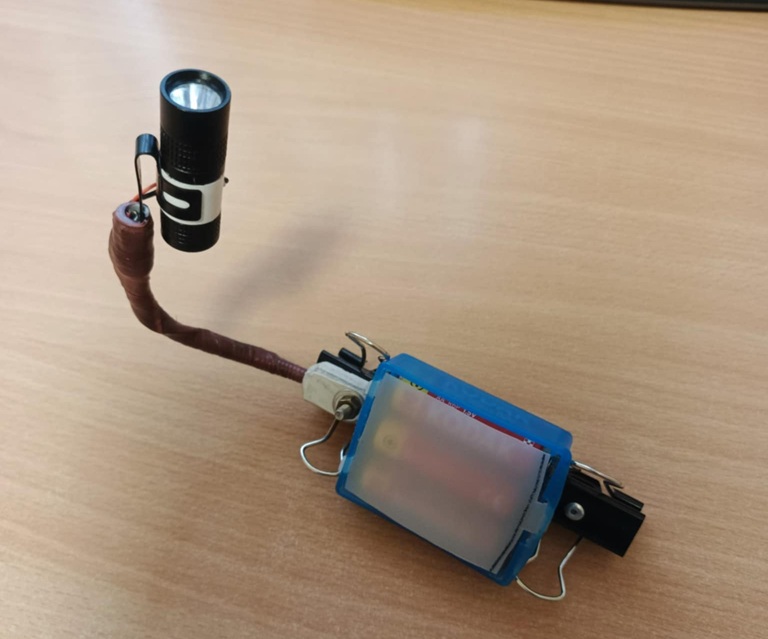 Latarkę przerobiłem tak, że został z niej jedynie element z diodą i „dupka” w którą wstawiłem włącznik z jakiejś grającej i świecącej zabawki. Do tego – doczepiłem giętki uchwyt pozyskany z jakiejś lampki led-usb. I „moduł” zasilania – koszyk na 3 baterie AA, który przerobiłem tak, że baterie połączone są równolegle. Czyli napięcie jak z jednej, ale pojemność x3 baterii. Wszystko to spiąłem do kupy, polutowałem, ponitowałem. A jako mocowanie do podpórki – zastosowałem zwykłe klipsy biurowe do papieru.