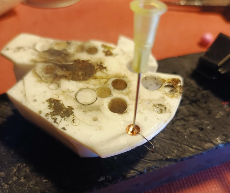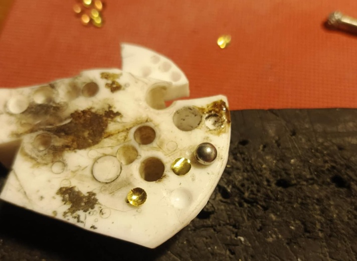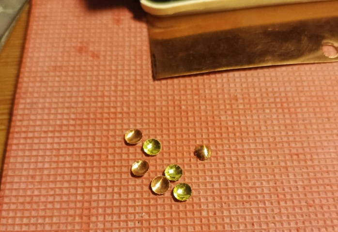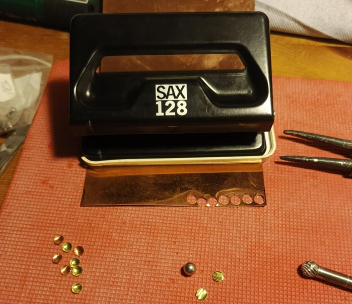 Powstały one z blaszki miedzianej i mosiężnej 0,2mm, wycinanej dziurkaczem biurowym, formowanej kulką z łożyska w formę miseczki i lutowane cyną.