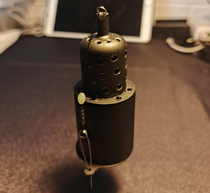 Pierwszy - "sputnik"- podajnik wykonany z blachy mosiężnej 0,5. Lutowany. Ciężki - robi też za gruntomierz. Samootwierający się bezwładnościowo po szarpnięciu "windą", i mieści kulkę zanęty wielkości orzecha włoskiego: