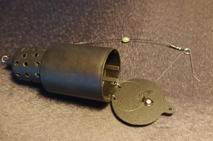 Drugi - z tworzywa (nawet nie wiem co to było pierwotnie - jakiś szpej), z mechanizmem otwierania opartym o zawleczkę ze sprężynującego drutu. Mieści dwa razy więcej zanęty niż sputnik :