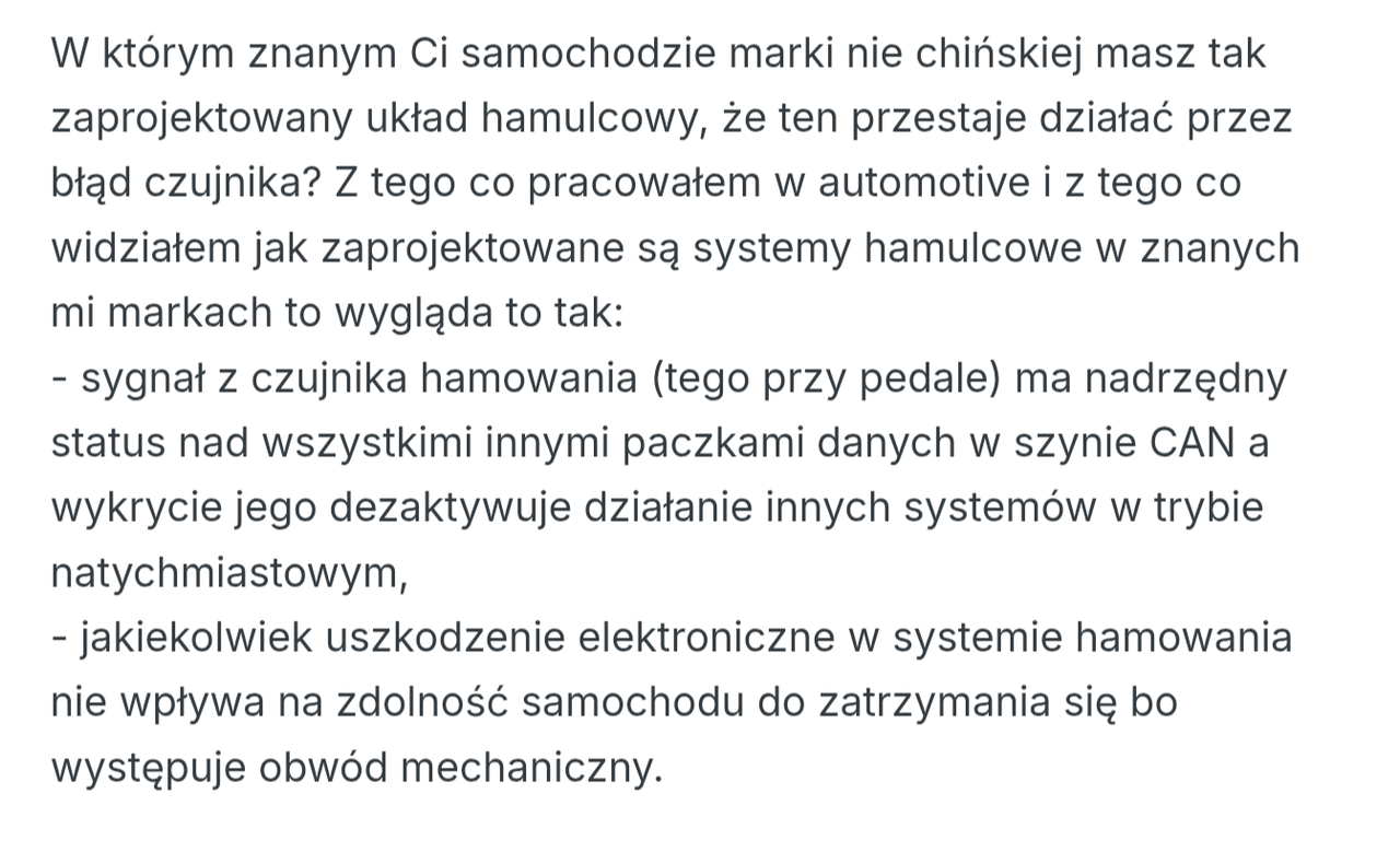 Kłopoty z wyłączającymi się systemami bezpieczeństwa to nie NAGŁA UTRATA HAMULCÓW! Ty nie pojmujesz, jakim zagrożeniem jest brak hamulców? Porównujesz to do awarii-pierdół? Dobrze że jechał 40km/h, a nie na autostradzie albo krajówce i musialby hamować przed traktorem z bronami który z podporządkowanej mu wyjeżdża. Żadne normalne auto nie ma tak skonstruowanego układu hamulcowego, że błąd jednego czujnika uwala cały system!