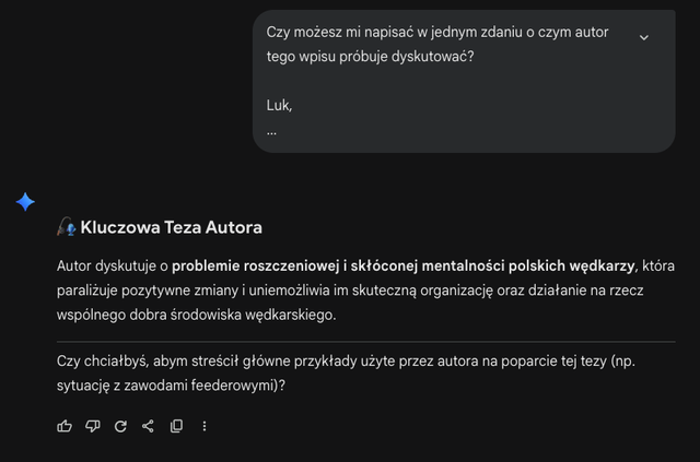 Lamentujący i roszczeniowi wędkarze są jak polacy, którzy wyjechali naście lat temu do Anglii mając wielkie pretensje i ubolewanie jak to źle się im żyje w naszym kraju. Od tamtego czasu zmieniło się u nas bardzo dużo i to na plus. A jak porównamy się (czego nie lubię robić) do innych krajów, które zaczynały mniej więcej z tego samego pułapu to dopiero zobaczysz różnicę. Oczywiście jest jeszcze wiele do zrobienia, a co z tymi polakami? Nagle zaczynają wracać, bo jednak okazuje się, że u nas zaczyna być lepiej niż w tym ich angielskim raju... kto te wszystkie zmiany zapoczątkował? Rząd? Politycy? Ci na samej górze? Nie. Dokładnie odwrotnie, Ci na samym dole czyli ludzie po prostu ludzie, bo to od nich się wszystko zaczyna, ale gdybyśmy podchodzili to tego wszystkiego na zasadzie, że to jest beton nie do skruszenia, że się nie da, że nie ma po co, to wiesz co Luk? Teraz w najlepszym przypadku byli byśmy jak Ukraina albo Białoruś ale jednak w latach osiemdziesiątych komuś się chciało i jaki jest teraz tego efekt? Chyba nie muszę tłumaczyć tak prozaicznych rzeczy bo to widać gołym okiem, ale niektórzy nie widzą tego bo najdalej gdzie patrzą to czubek swojego nosa.