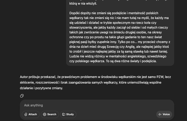 W pełni się z Tobą zgadzam odnośnie tego co się dzieje aktualnie w PZW, ale po pierwsze nikt się tutaj nie kłóci tylko próbujemy merytorycznie dyskutować, po drugie my z Gabrielem w ogóle nie mówimy o tematach PZW i jego sposobie zarządzania, bo to co napisałeś Ty i co napisał kolega Azga - to my się z tym zgadzamy i każdy kto coś próbuje działać zna ten temat od podszewki. Nam nie trzeba tego tłumaczyć, bo już rzygamy tym tematem. My tutaj piszemy o podejściu wędkarzy do tego wszystkiego ot cała dyskusja. Jako wędkarze pisząc o ogóle jesteśmy w swoim własnym środowisku skłóceni dosłownie każda grupa z każdą zapominająć o tym, że wszyscy gramy albo powinniśmy grać do jednej bramki. Kto na tym traci a kto zyskuje - to chyba oczywiste. Coraz częściej patrzą nam na ręce inne podmiotu spoza naszego wędkarskiego półświatku, a my dalej jak te sieroty skłóceni roszczeniowi czekamy aż problem sam się rozwiąże lub ktoś to zrobi za nas. Gabriel pisze o pozytywnych zmianach to inny wędkarz zaczyna go dojeżdżać jakimiś depresyjnymi tekstami wyśmiewając i zastraszając jednocześnie, że mu to wszystko zabiorą. Wędkarz wędkarzowi? Rozumiesz to? Tak to u nas wygląda, a teraz pomyśl sobie co się nad wodą musi dziać, tego typu podejście i hasełka są na porządku dziennym - to jak chcesz tutaj działać jak z każdej strony masz dojazd mentalny? Jak dziesięć razy ktoś Ci powie, że się nie da to sam zaczniesz rozważać czy to co robisz ma sens.